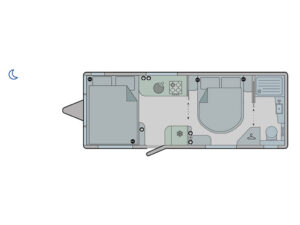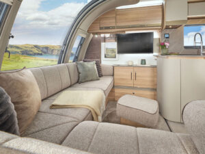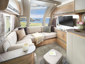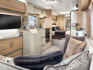 - Twin axle 8-ft wide model, with L-shaped front lounge and rear island king size bed, catering for up to 4 people