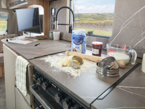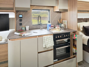- Extended kitchen with additional worktop space and storage featuring a Thetford 156L tower fridge