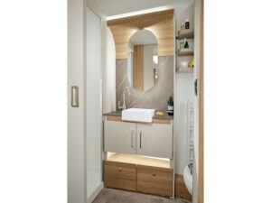 - Bailey ‘Natural Oak’ curved overhead locker doors with ‘Pearl Bronze’ detailing