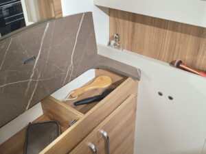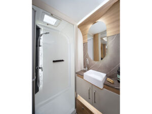 - Onboard shower with fitted shower tray, Ecocamel shower head, riser bar and combination mixer tap