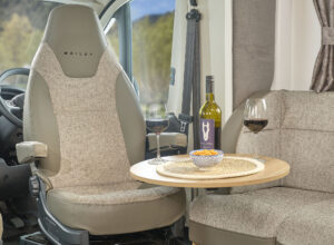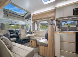 • Spacious L-shaped front lounge, with twin dedicated travel seats featuring ISOFIX, which converts into an additional double bed