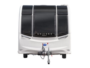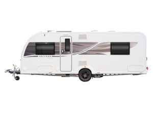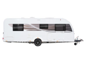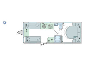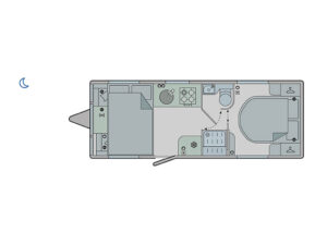 - Single axle, 7’5” wide model for up to 4 people with parallel seat front lounge and rear island double bed