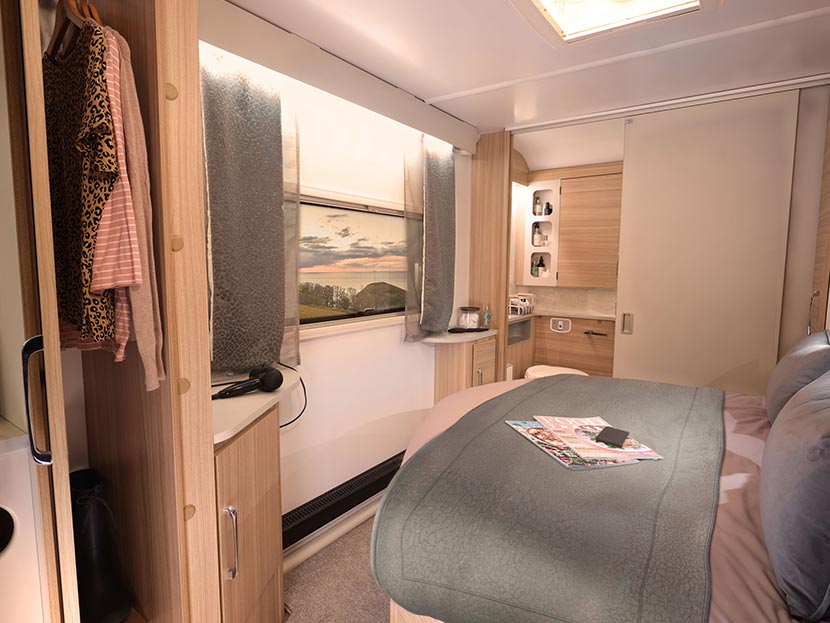 Effortless practicality meets simple elegance. Packed with new features, the new Unicorn range sets a new standard, so you can escape in both style and luxury. Packed full of top-level features including a newly designed interior, additional storage throughout and a new vertical front infinity window which is now 50% larger in size – it’s just down to which one will suit your needs the best. The Cartagena twin axle caravan is popular with couples as it has the convenience of an island bed, rear washroom & additional packing space.