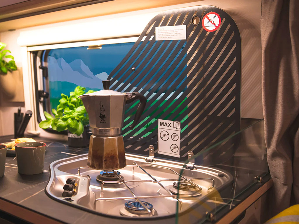 Despite its compact dimensions, the kitchen offers a generous work surface. This space can be further extended via the glass lid of the cooker and an optional sink cover. Crockery, pans and food can be tidily stored away in the cabinet underneath the kitchen worktop. The 2 burner hob, which features flame protection and a glass cover plate as standard, leaves nothing to be desired in terms of culinary delights. And your ingredients will stay nice and fresh inside the practical, integrated refrigerator with a capacity of 81 litres