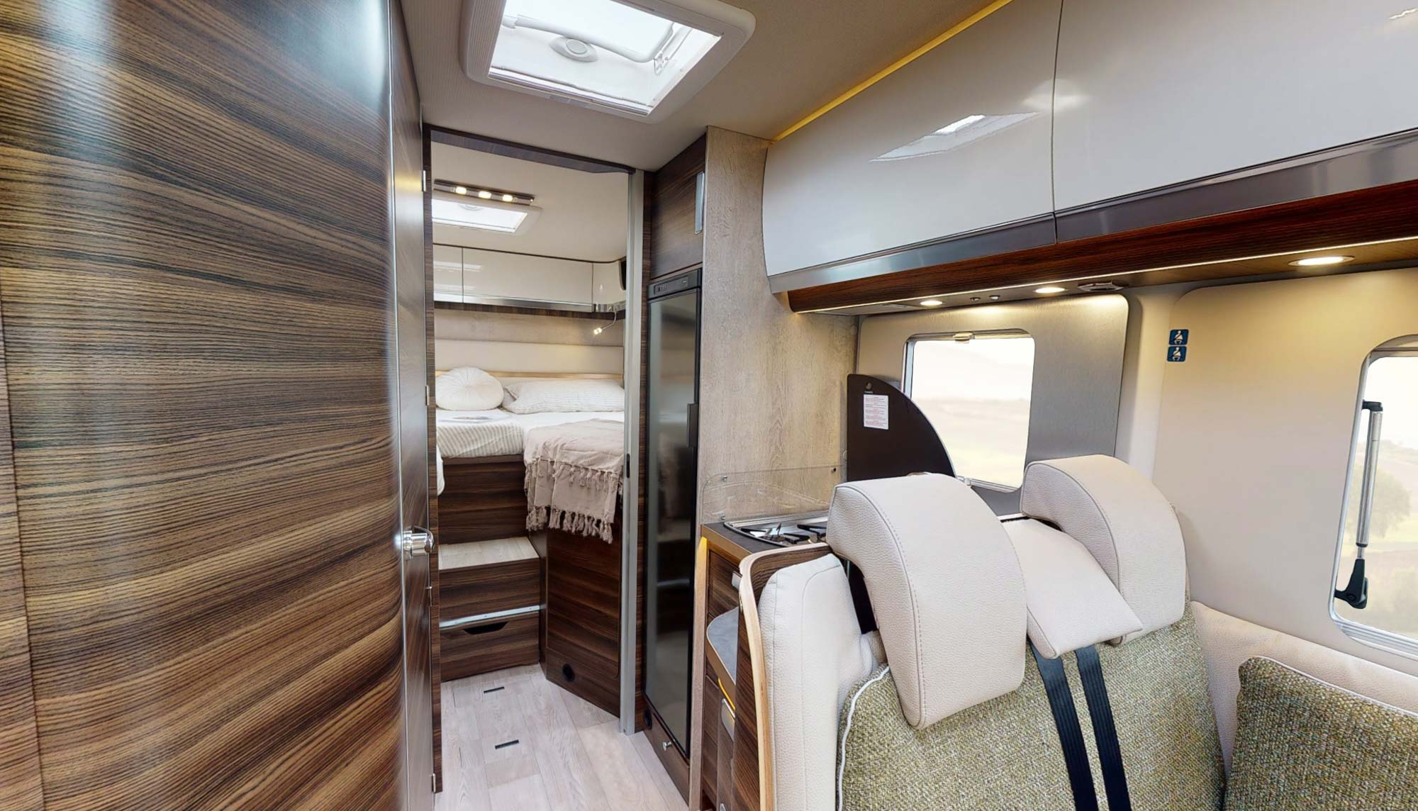The Ecovip fully integrated A-Class has a large lounge with face-to-face bench seats. 5 people can be seated around the fold-out dining table. It’s a perfect layout, both for entertaining and in terms of ease of movement.