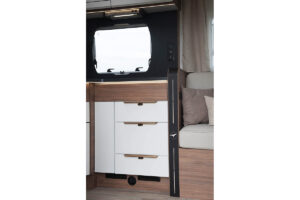There’s so much to love about this compact low-profile with its polyester roof and sides. The anti-hail sides ingeniously incorporate all the motorhome’s service compartments. The easily-accessible hatches provide a simple solution for draining wastewater. The large 2,260-litre boot storage is low and can be loaded from both sides making it a cinch to bring your bikes or camping gear on the road. Select an optional side skirt drawer for additional storage space.
