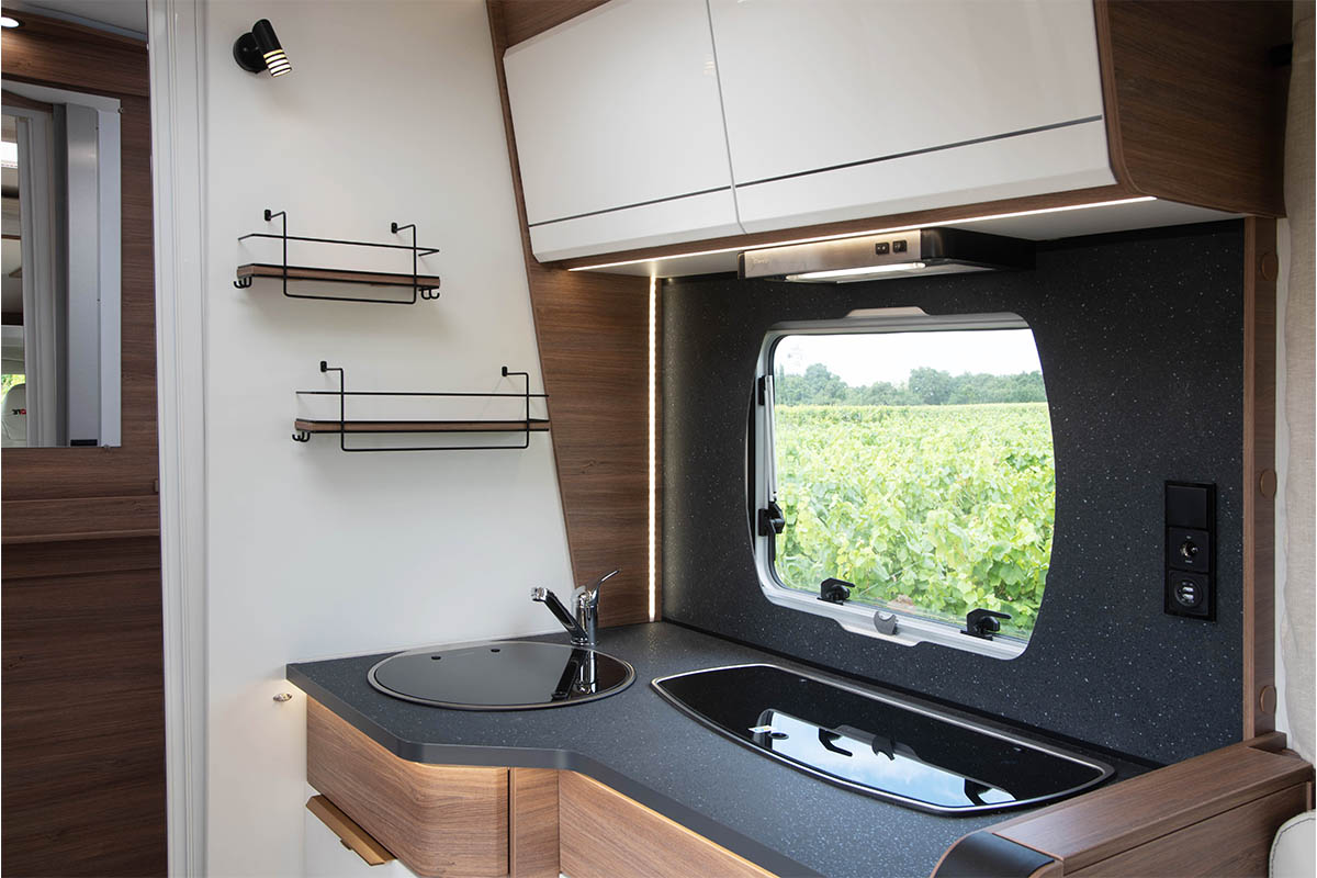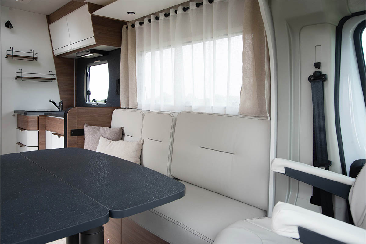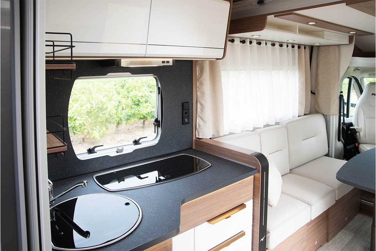 As large as that of a 6.99 m low-profile, the P696D lounge has a bench seat facing the road. It can bring together up to four guests around its table. With an ingenious flip-up seat on the kitchen wall, five people can be seated around the table.